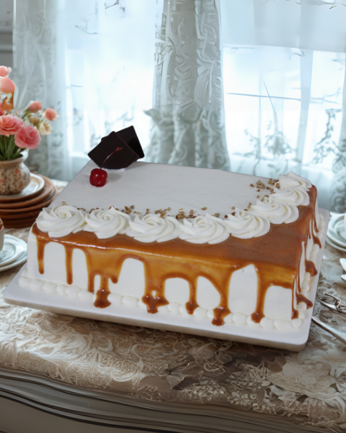 Pastel húmedo con nuestro jarabe de cajeta; relleno con nuez y la deliciosa crema batida de la magnolia. ¡Un toque suave, pero con mucho sabor!